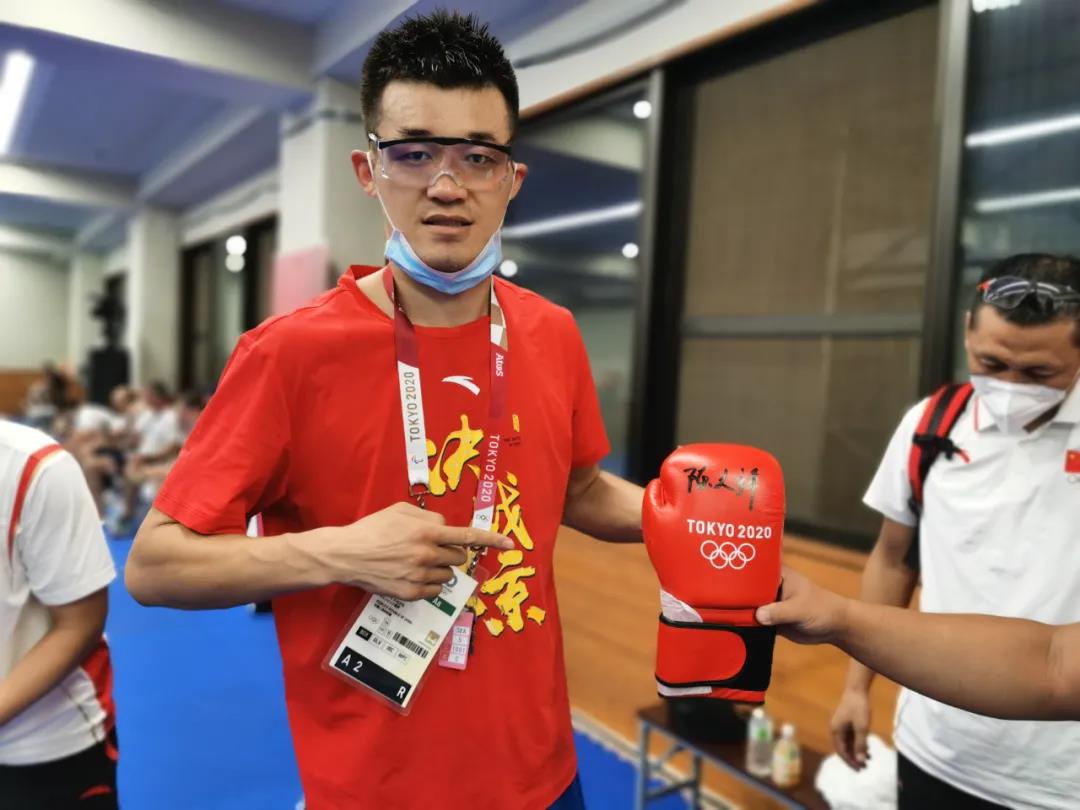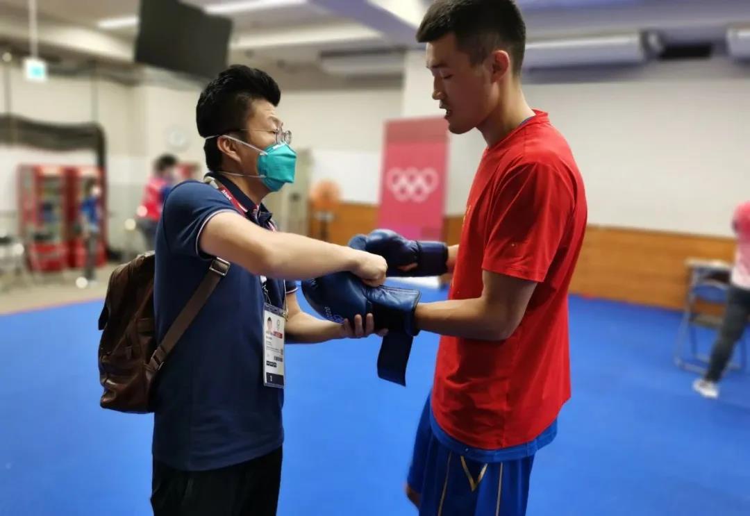 东京奥运会拳击热身馆,熊猫体育工作人员帮助运动员穿戴拳击手套