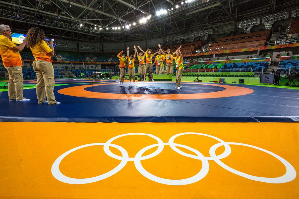 2016年8月18日,在里约奥运会摔跤场馆内,场馆工作人员和志愿者在摔跤垫上合影留念,这届奥运会的摔跤垫来自中国山东熊猫体育集团。新华社记者刘彬摄