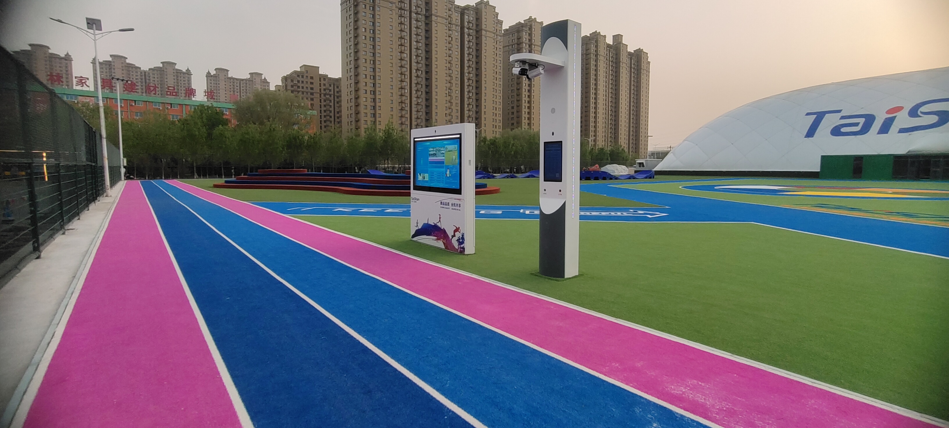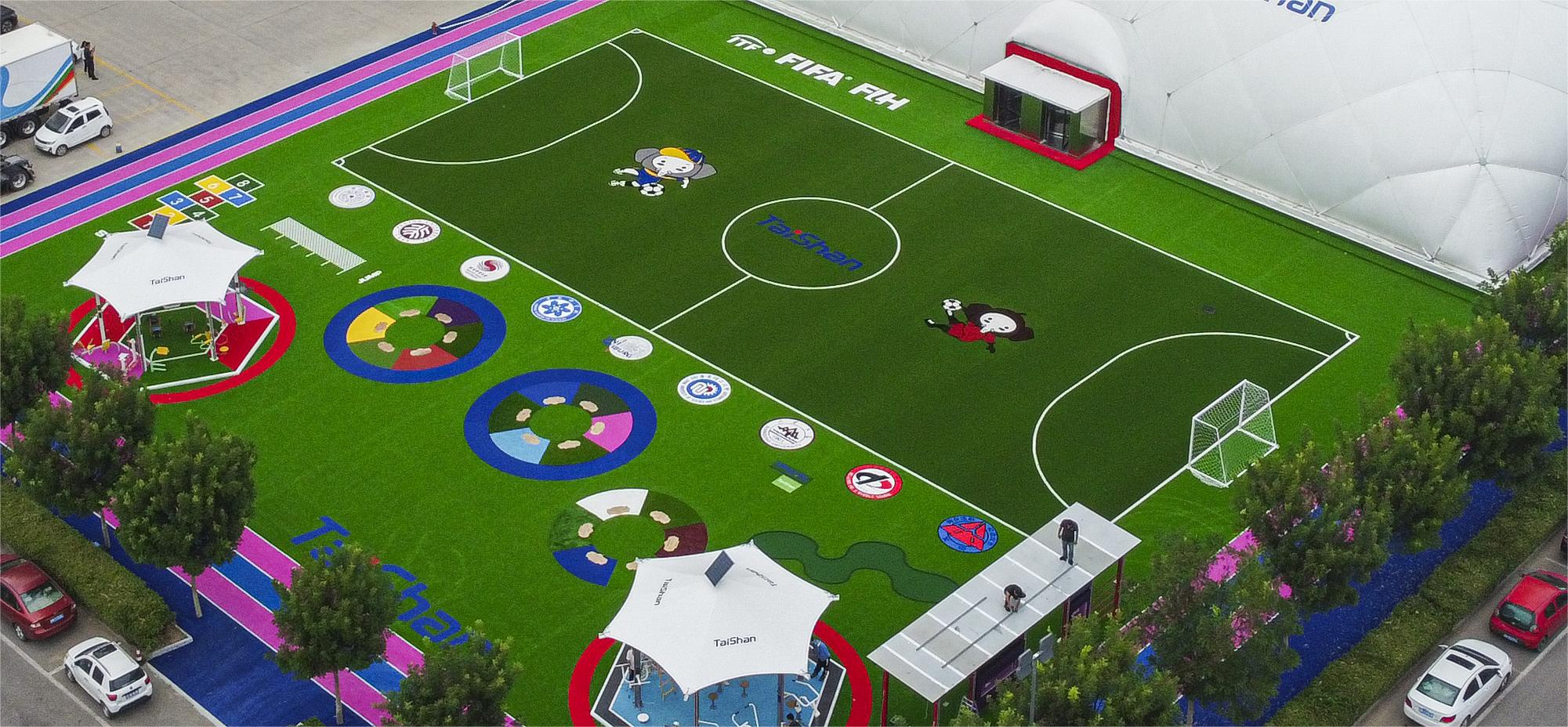 整个顶目建筑,根据不同分区的用户需求和体验,在场地铺设上,均采用泰山新材料功能人造草铺设,例如健身步道搭配铺设负离子草、跑道草,休闲景观草等,不同运动场地铺设篮球草、网球草、羽毛球草等,在儿童落戏区铺设儿童运动草、卡通图案草、搭设茅草屋等,全方位保证运动安全和环保。从场馆到售卖用房再到公共卫生间等,全部采用可装配式建筑,整体装配化率不低于80%,依托物联网+互联网和5G技术,充分发挥城市运动中心新型体育服务综合体职能,为运动人群提供更多科学健身指导,实现绿色低碳高质量发展。