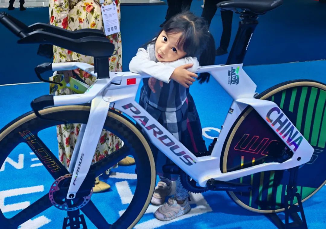 在消博会熊猫体育展区,一位4岁的小女孩趴在一辆为2028年洛杉矶奥运会设计的自行车上,久久不愿离开。这辆自行车洁白的车身上印着“中国”字样和炫酷的图案,尽显科技与运动的魅力。小女孩充满好奇地探索着,这一画面不仅洋溢着童真,更展现了奥运科技与大众的奇妙融合,也体现了本届消博会熊猫体育对普通大众的期待与关注。